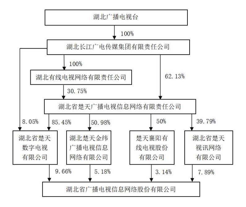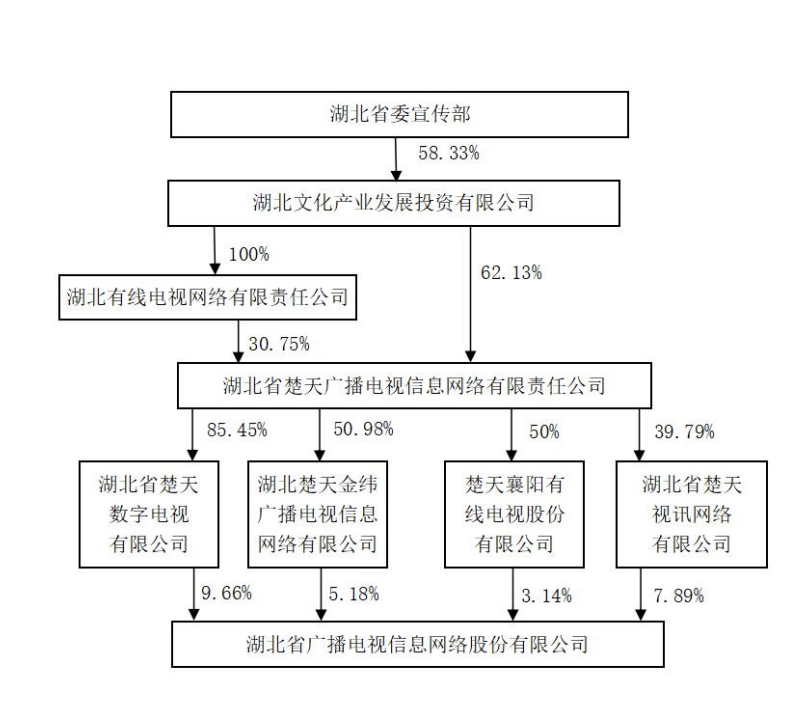 昨晚,湖北廣電網(wǎng)絡(luò)發(fā)布公告稱,公司于11月17日收到湖北廣播電視臺通知,其將通過全資子公司長江廣電集團,把持有的楚天網(wǎng)絡(luò)62.1289%股權(quán),以及另一全資子公司湖北有線電視網(wǎng)絡(luò)有限責任公司100%股權(quán)(后者持有楚天網(wǎng)絡(luò)30.7458%股權(quán)),一并無償劃轉(zhuǎn)至湖北文化產(chǎn)業(yè)發(fā)展投資有限公司(簡稱“湖北文投”)。