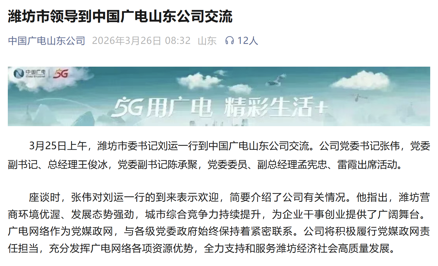 隨著謝寧的升任,中國廣電山東網(wǎng)絡(luò)有限公司新任領(lǐng)導(dǎo)也已調(diào)整到位。 3月26日官方消息顯示,在3月25日濰坊市委書記劉運(yùn)一行到公司的交流活動中,張偉已以公司黨委書記身份出席,標(biāo)志著其正式接棒謝寧出任該職。