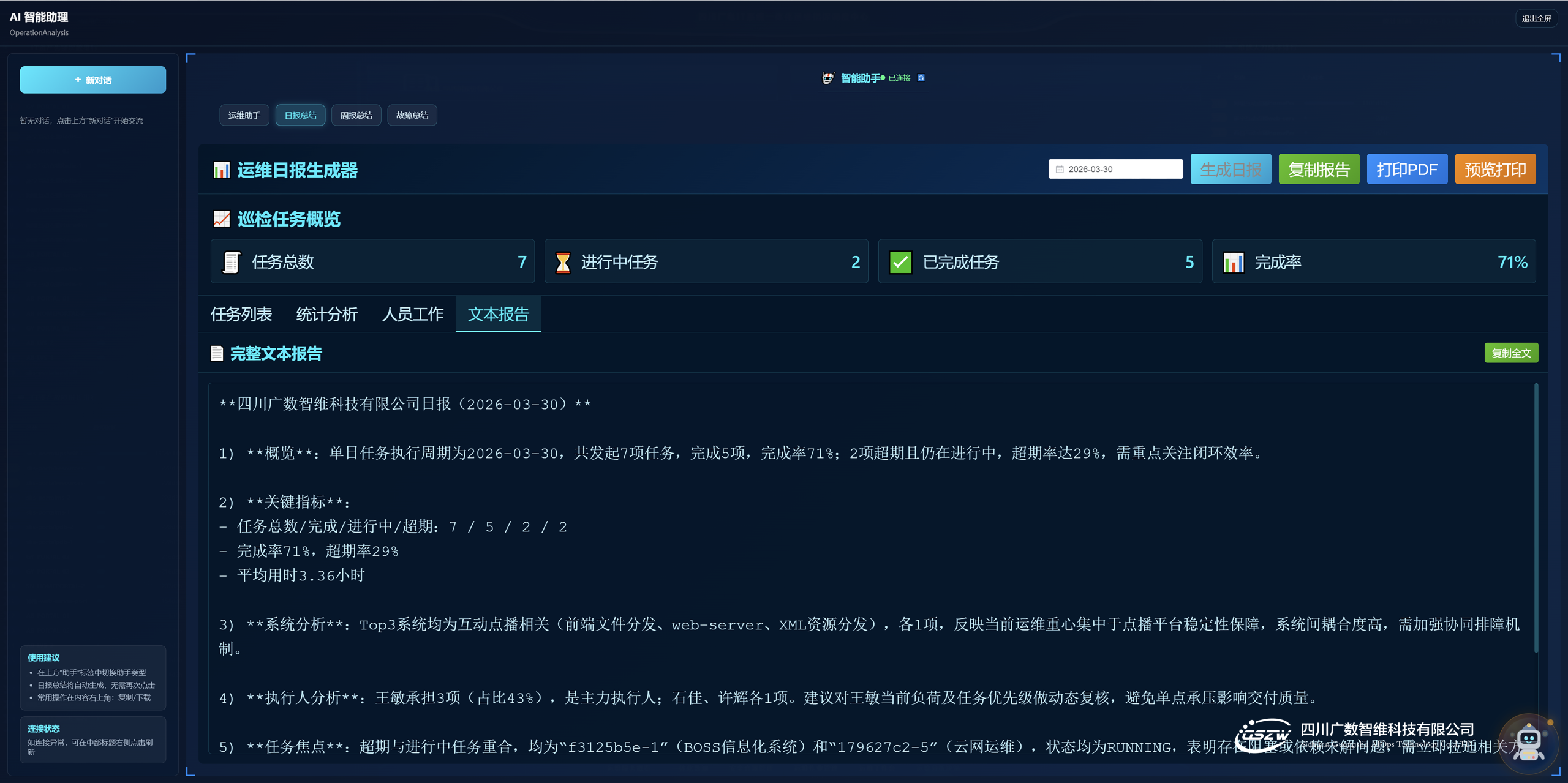 平臺還深度集成企業(yè)內(nèi)部協(xié)作工具,告警工單自動推送,視頻遠(yuǎn)程調(diào)度支持,7×24小時智能問答助手隨時提供排查指引,報告助手自動輸出結(jié)構(gòu)化運(yùn)維報告,不僅使故障處理效率提升50%以上,更能助力管理者科學(xué)決策、精準(zhǔn)調(diào)度,為保障全省用戶穩(wěn)定收視提供堅實(shí)支撐。